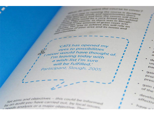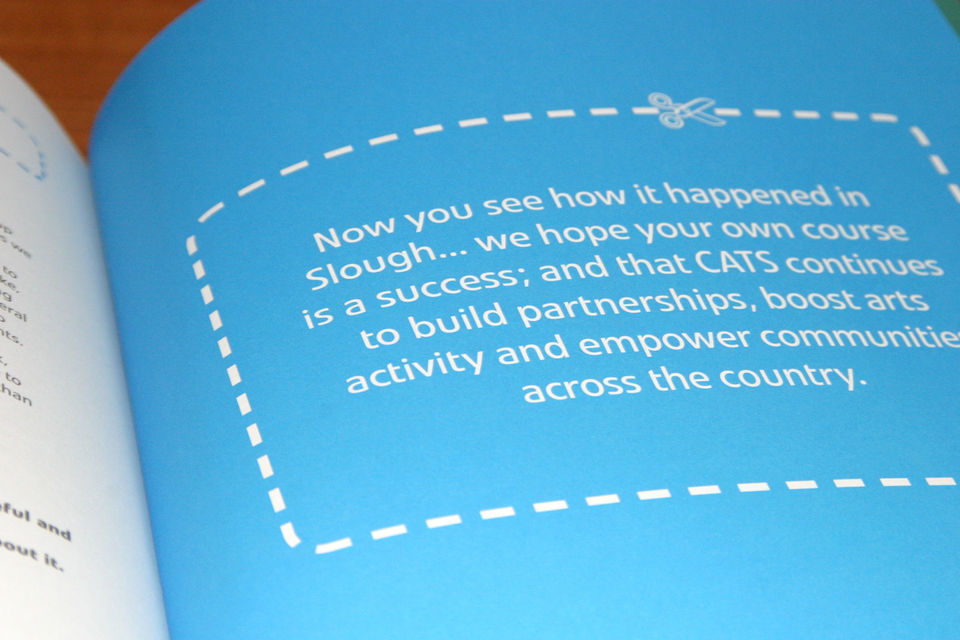 CATS is Slough Arts Development’s practical course for running arts projects in the community. It is delivered through talks, workshops practical sessions, group projects and discussions. The course covers: fundraising, marketing projects, what support Arts Development can provide, allies and partners, working with professional artists, project planning and legal aspects. The design needs to show the impact that CATS have had in Slough and show how arts officers can adapt the course to run in their own area. It must be fully accessible and easy to use. One restriction was the use of no photography. This was due to budget restraints as well as the client asking for a fresh approach.